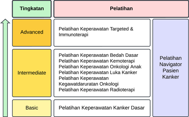 Pelatihan disini bertujuan benar-benar untuk mencapai sasaran jangka pendek, dimana perawat mendapatkan pelatihan secara singkat dan segera bisa mendapatkan keterampilan dalam mendukung tatalaksana pasien kanker. Pelatihan ini perlu diatur agar benar-benar dapat mendukung kualitas pelayanan kanker, sehingga diwajibkan bagi perawat yang bekerja di pelayanan kanker untuk mengikuti jenjang pelatihan sesuai dengan kebutuhan pelayanannya. Pelatihan Keperawatan Kanker Dasar menjadi fondasi dan diwajibkan bagi semua perawat yang bekerja di pelayanan pasien kanker.