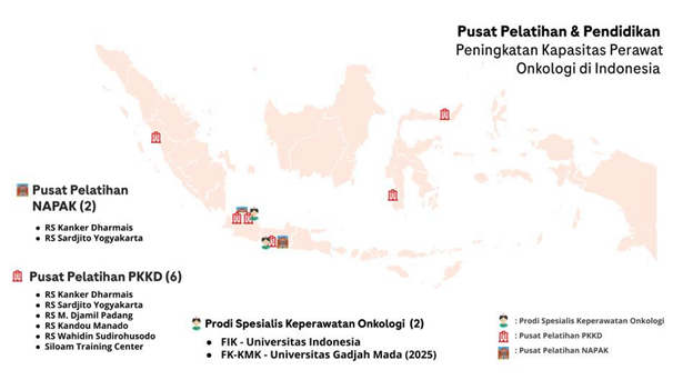 Yang tidak kalah penting, strategi juga perlu memenuhi kebutuhan jangka panjang, dimana perawat dapat menjadi mitra strategis bagi para ahli onkologi dan pemangku kepentingan dalam tata layanan penyakit kanker. Untuk itu, kami juga membangun kerjasama dengan akademisi dari Fakultas Ilmu Keperawatan Universitas Indonesia dan Fakultas Kedokteran, Kesehatan Masyarakat, dan Keperawatan Universitas Gadjah Mada. Di masa yang akan datang, akan terdapat lebih banyak lagi universitas yang akan membuka program spesialis keperawatan untuk mendukung tatalaksana kanker.